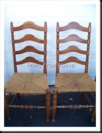 Do you remember my other ladder back chairs that I found on craigslist? Well, since I had my farm table, I wanted some prim looking ladder back chairs to go with my table. I found two awhile back and re-finished them. I loved the way that they turned out, but I still needed more. So, I have been searching craigslist to see if I could find some more. Well, after many months of searching for more ladder back chairs…. I found more!! I was so excited to find some more. Of course they don’t match the others exactly, but I can put these on the sides of the table and the other two at the ends of the table. The fiber rush seats are not in that great of shape, but within time I am hoping to have them re-finished. I didn’t have a clue as to how expensive it was to re-finish the seats, but it is quite expensive. They will re-finish the seats, but they charge by the inch and if you think about it…. the seating has to be sturdy enough to hold someone so think about how many inches they would need to make it sturdy enough. Yep, that is alot of inches (lol). Anyway, I am going to re-finish my new chairs in black of course so they match the other two and I will just simply cover the seats up with some prim chair pads until I can get them re-done. So, are you ready to see my ladder back chairs? I was definitely pleased with my find, but just wish they were in a little better shape. I guess after I finish them…. they will look ALOT better. Anyway, here are the chairs.